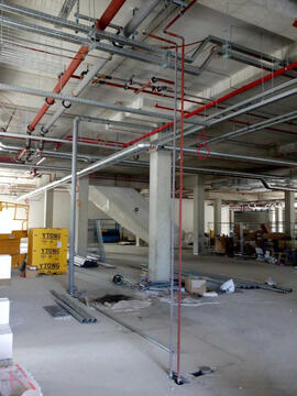 Here our task was to complete the main hot and cold water distribution system, install sanitary fixtures and faucets, set up the sewage, firefighting water, fire hydrants, connect the HVAC units, and create condensates from HVAC as well as from fan coils in the building.
